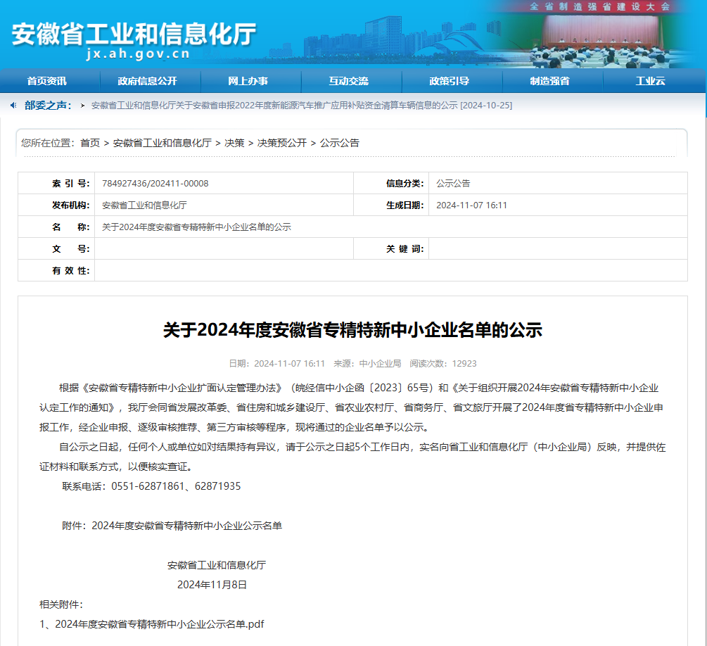 近日安徽省工業(yè)和信息化廳發(fā)布了2024年度專精特新中小企業(yè)公示名單集團(tuán)所屬池州市數(shù)據(jù)產(chǎn)業(yè)有限公司榮獲2024年度安徽省“專精特新”中小企業(yè)。